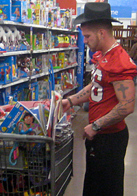 竞争对手在Garner,N.c.,沃尔玛,因为NC州橄榄球队的成员占据了一段时间冠军运动碗准备在他们的球衣上覆盖呼啦圈,并在寻求中加载推车成为Tots计划的海军陆战队玩具的顶级购物者。