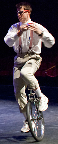 选美比赛的最终胜利者,“先生先生机械工程师“斯蒂芬史密斯('12),将他的独轮车技能转动到中心舞台,在朋友周围踩着圈子,同时解决魔方的立方体。