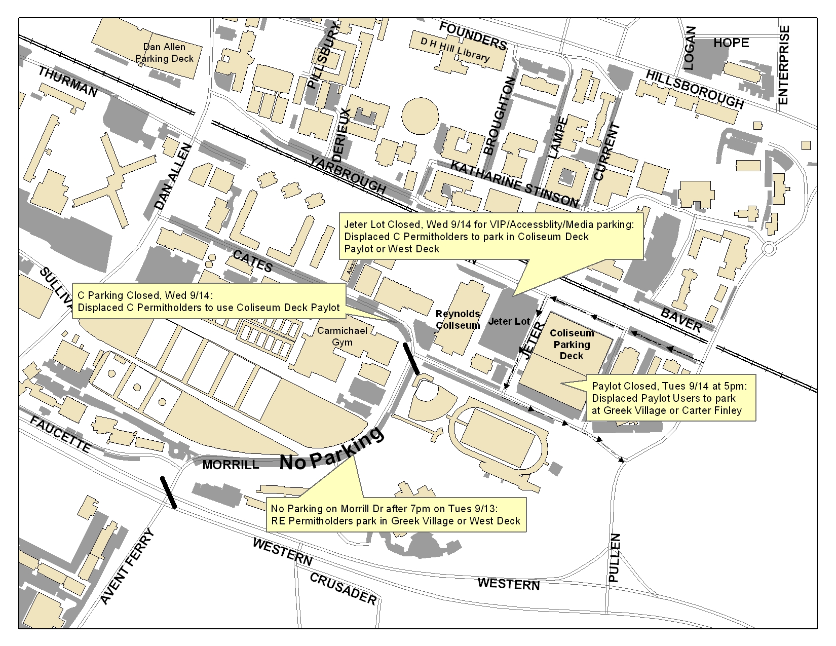 Jeter地块、Morrill Drive和Cates Avenue的C许可证持有人被要求将车停在竞技场甲板的支付区(竞技场甲板的最低层)或Sullivan Drive的西甲板。