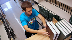 今年夏天,帮助她在最后期限前完成工作的卡尼-麦克尼古拉斯公司(Carney-McNicholas)聘请了60名学生,对数十万本书进行清洗和包装,然后把它们装上一辆货车。这辆面包车每天在两个图书馆之间往返四次,每次大约携带3500件物品。搬迁计划早在夏天之前就开始了。在过去一年半的时间里,十几名学生一直在与匹克合作,对这些书进行测量和颜色编码。