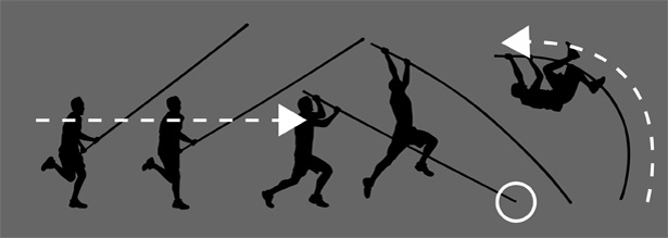 接下来,身体靠在杆子上,导致杆子弯曲。运动员的动能变成了弯杆的势能。现在利用运动员的冲力使杆子弯曲,产生大量的势能。当这个势能被释放时,它又被转移回运动员身上——使他或她向前/向上弹射。最后,当他在空中飞行时,他开始是倒着的,然后旋转他的身体,使他的胸部朝下。在他的运动轨迹达到顶峰时,他的身体需要越过杆子。