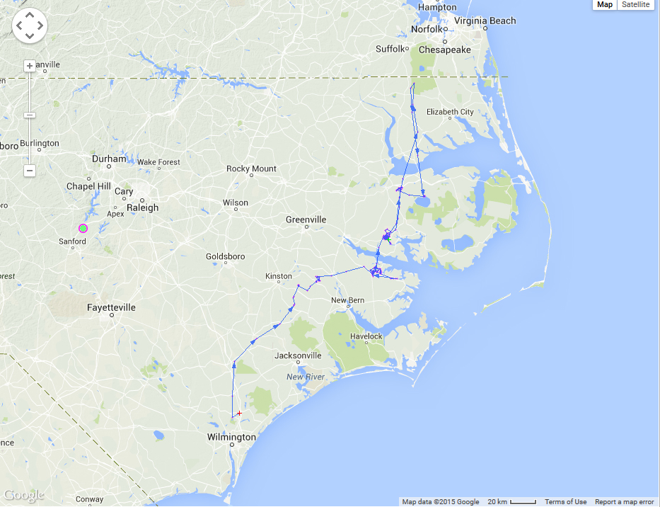 我不知道这是不是你跟踪的,但我看到一只秃鹰飞过道路大约200码南的RL Lewis路在87号高速公路在不伦瑞克县2015年10月11日下午1点