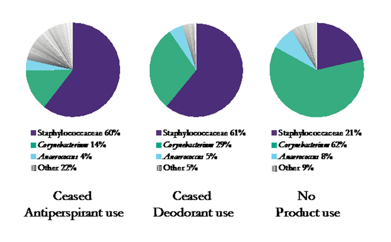 那些经常使用止汗剂的参与者进入研究时得到了截然不同的结果。60%的微生物是葡萄球菌科,只有14%棒状杆菌在“其他”下提出了超过20%的人 - 这意味着它们是一袋机会主义的细菌。