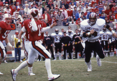 1986年11月1日:随着时间的流逝,狼队有了最后的机会击败来访的南卡罗来纳,多亏了gamcock的点球。未来的NFL四分卫埃里克·克雷默(Erik Kramer)利用边线上的尘土,在“万福玛丽”(Hail Mary)投球时,在南端区后面找到了双运动明星丹尼·皮布尔斯(Danny Peebles),让狼队获得了学校历史上最不可能、最戏剧性的胜利之一。