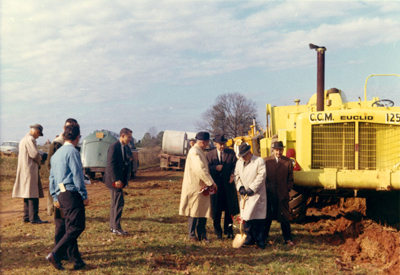 1964年12月14日:在北卡罗莱纳州游乐场附近的一个前研究池的场地上,一名工作人员破土动工,准备建造一座设施,取代北卡罗莱纳州陈旧的校园里的里德克体育场。这片75英亩的土地也被用来为北卡罗来纳州农业部种植苜蓿和玉米,几十年来一直被称为监狱农场。这一大片土地最初归罗利创始人乔尔·莱恩所有,一个多世纪以来一直作为农地出售,直到联邦政府将其大部分变成了波尔克营地,这是第一次世界大战期间美军唯一的坦克训练场(同一片土地中的一些曾经是曼格姆营地的一部分,曼格姆营地是南方军的一个训练场,由少校氏族指挥。1920年1月1日,这片土地全部移交给了北卡罗来纳州监狱系统,后来又被划分为波尔克青年中心、北卡罗来纳州集市、梅雷迪斯学院、北卡罗来纳州艺术博物馆、北卡罗来纳州兽医学院和研究农场。新体育场的筹款工作由北卡罗来纳州体育场发展委员会牵头,该委员会由罗利商人沃克·马丁担任主席。