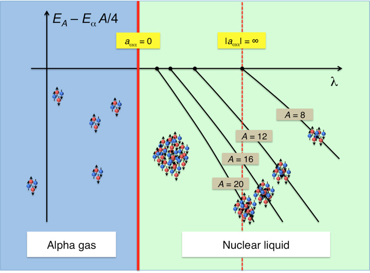 “我们发现了一项量子阶段过渡,我们没想到的是,”李说。“当我们使用局部相互作用将两根氦-4核或α颗粒放入核子的局部相互作用时,它们粘在一起,但它们没有局部相互作用。α颗粒之间的相互作用在零温度下确定我们是否以培养气体或核液体结束。并且那些α颗粒相互作用取决于核仁相互作用的强度和局部性。