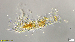 科拉迪诺说:“纳米鞭毛虫是单细胞浮游真核生物,大小从2微米到20微米不等,可以有多种营养策略。”这些生物(不是鲨鱼)可能被认为是海洋中最强大的食肉动物。在这张图片中,我们看到30多个纳米鞭毛虫从一个更大的浮游植物细胞“搭车”。在某些情况下,纳米鞭毛虫可以感染海洋中的浮游生物,通过海洋食物网在能量传递和营养循环中起着重要作用。