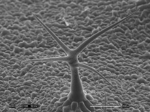兰德说:“这张扫描电子显微照片捕捉到了拟南芥毛状体或‘叶毛’令人印象深刻的三维结构。”这些毛状体看起来像一棵生长在草地上的树,实际上是从叶表面长出来的单细胞附属物。在背景中,还可以看到表面细胞和孔状气孔。