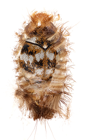“昆虫及其亲属(称为节肢动物)是室内生物群系的共同点和有时丰富的组成部分,”Bertone说。“人类与许多物种的节肢动物一起生活,其中一些与家庭密切相关,并且能够在我们相对无菌,建造的环境中茁壮成长。地毯甲虫(鞘翅目源:Dermestidae.)发现在最近对北卡罗来纳州的北卡罗来纳州的一项调查中取样了100%的房屋(和57%的房间)。虽然有时羊毛地毯和衣服有害,但这些昆虫通常在头发,羽毛,干食物和死昆虫喂食。它们也是在其他动物的巢中发现的,这是一个可能使他们与我们住在一起的习惯。我的照片显示成年甲虫完成开发,并在前幼虫皮肤中休息。