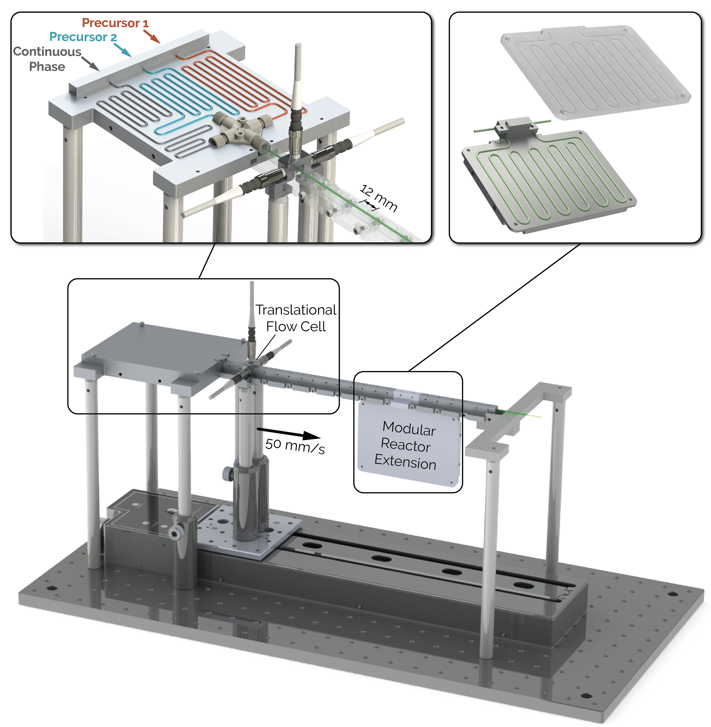 文摘:胶体有机/无机金属卤化物钙钛矿纳米晶体最近作为一种潜在的低成本替代半导体材料在商业光伏和发光二极管。然而,与III-V和IV-VI半导体纳米晶体不同,胶体钙钛矿纳米晶体的研究尚未对成核和生长动力学有基本和全面的了解。在这里,我们介绍了一个模块化和自动化的微流控平台,用于系统研究室温合成的铯铅卤化钙钛矿纳米晶体。通过四个数量级反应时间跨度的完整数据收集,我们全面地描述了模块化微流控反应器内纳米晶体生长的特征。该开发的高通量筛选平台具有定制设计的三端口流池,具有平移能力,可沿着管状微反应器(长度从3厘米到196厘米不等)对流中合成的钙钛矿纳米晶体进行原位光谱表征。平动流动单元允许在一个平衡流速下采样20次独特的停留时间。该技术要求每个光谱平均总液体消耗量为20 μL,取样时只需2 μL。它可以连续采样多达30,000个独特的光谱,每天在单和多相流格式。利用开发的即插即用微流控平台,我们研究铯的增长导致trihalide钙钛矿纳米晶体通过原位监测他们的吸收和发射带隙在居留时间从100毫秒到17分钟。自动微流体平台使混合增强效应的系统研究在合成纳米晶体的质量通过 direct comparison between single- and multi-phase flow systems at similar reaction time scales. The improved mixing characteristics of the multi-phase flow format results in high-quality perovskite nanocrystals with kinetically tunable emission wavelength, ranging as much as 25 nm at equivalent residence times. Further application of this unique platform would allow rapid parameter optimization in the colloidal synthesis of a wide range of nanomaterials (e.g., metal or semiconductor), that is directly transferable to continuous manufacturing in a numbered-up platform with a similar characteristic length scale.