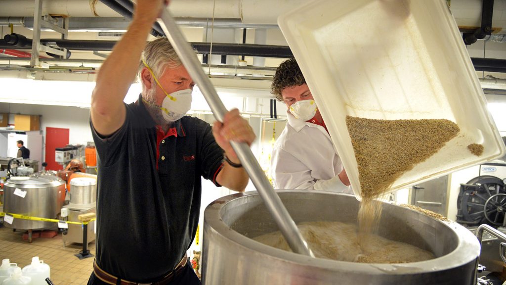 “这是一项真正的动手实践活动。学生们就在那里搅拌谷物和麦芽浆,并连接软管和泵。”“这和坐在桌前有很大不同。”