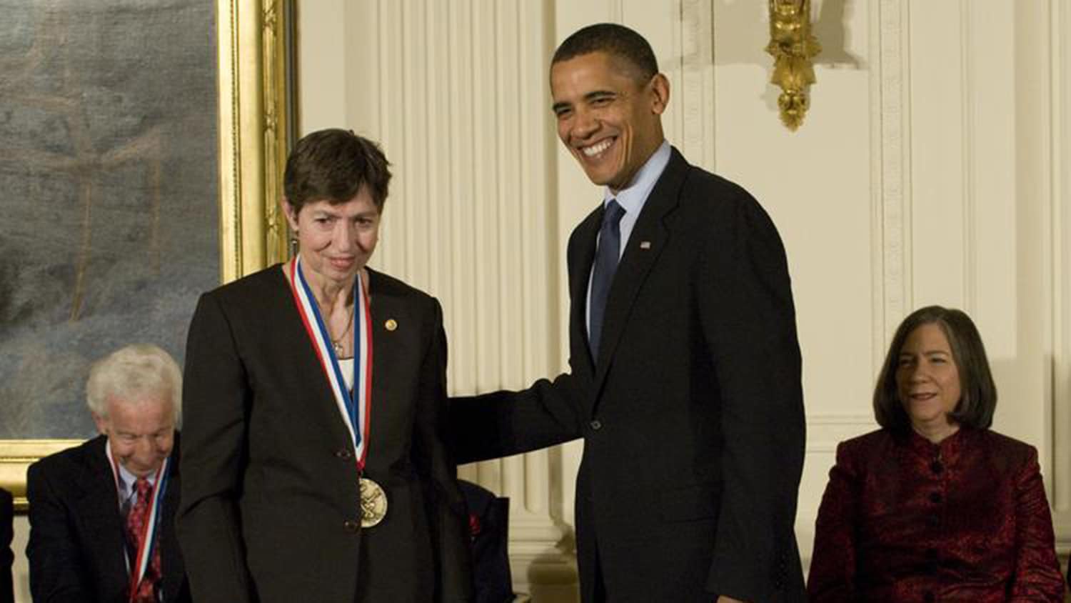 Marye Anne Fox,剩下,在2010年白宫仪式上与奥巴马总统代表全国科学勋章的接受者。照片:国家科学与技术奖牌基金会。