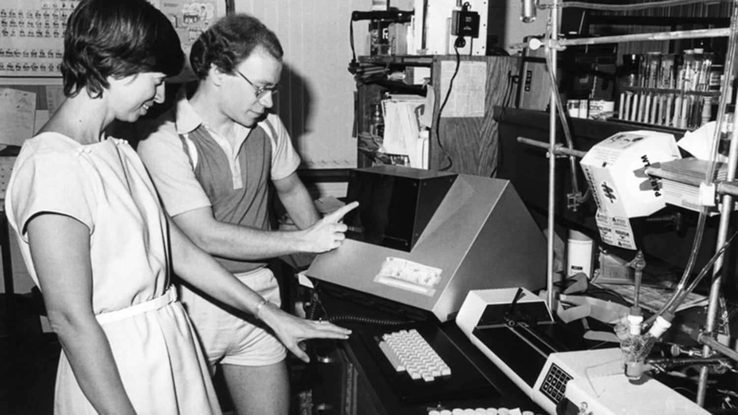 在20世纪80年代的照片中,玛丽·安妮·福克斯和一位身份不明的同事正在检查实验室设备。