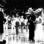 During the 1973-74 men’s basketball season, members of the cheerleading squad befriended their counterparts from UCLA, first at a made-for-television game in St. Louis, where the new Mr. Wolf costume made its debut, then at the NCAA semifinals in Greensboro. The West Coast school was one of the few in the nation at the time that had male and female mascots, Joe and Josephine Bruin.