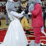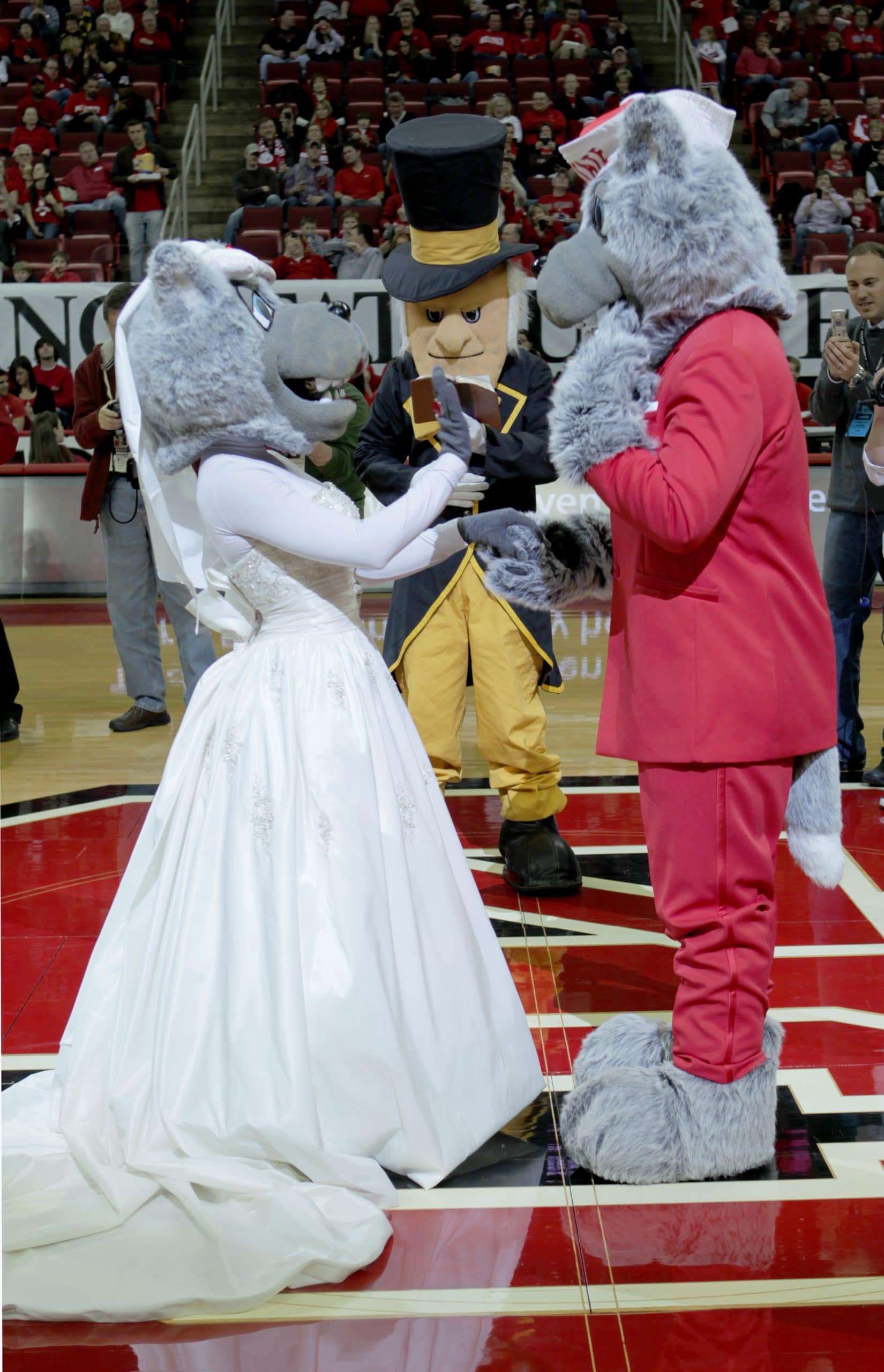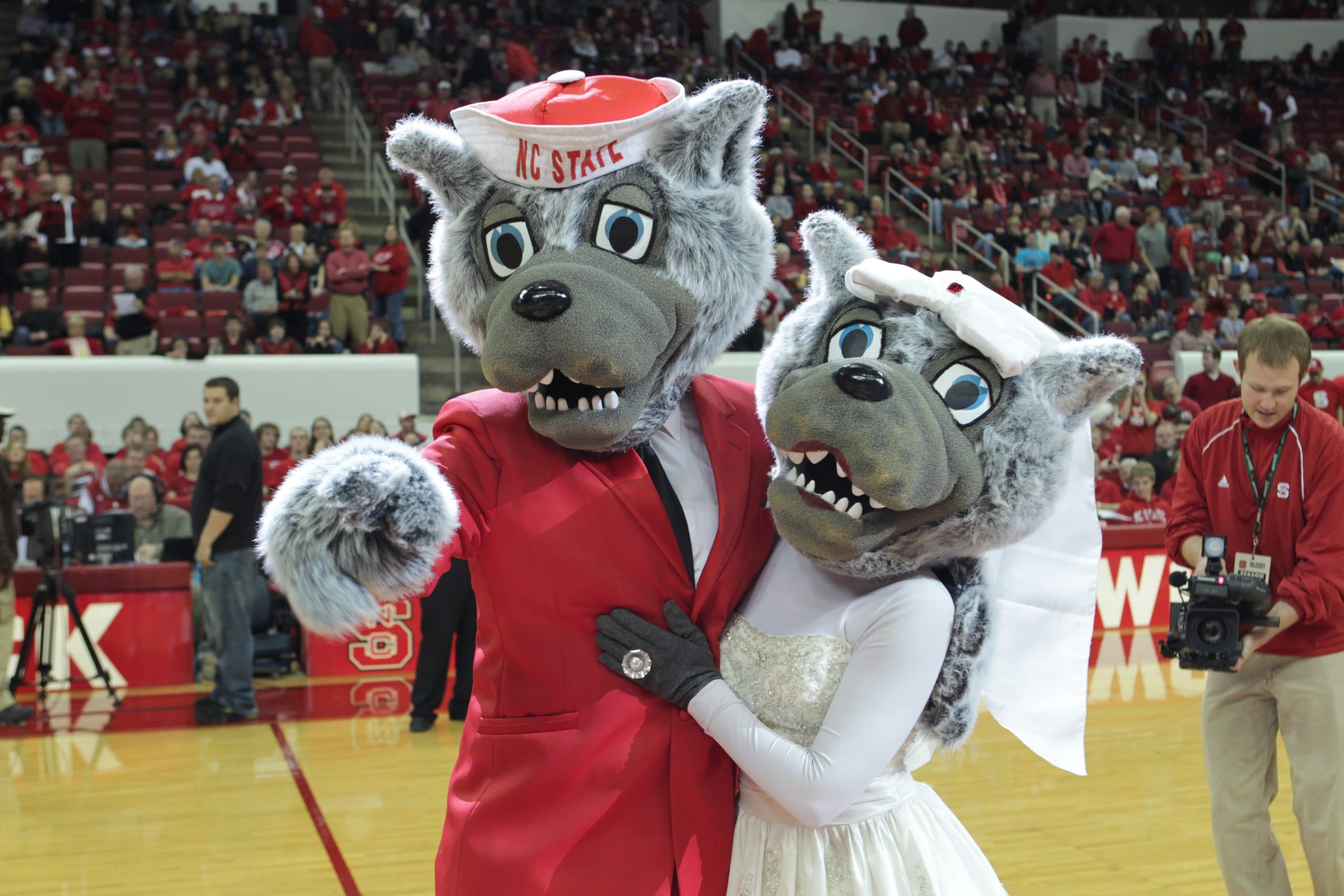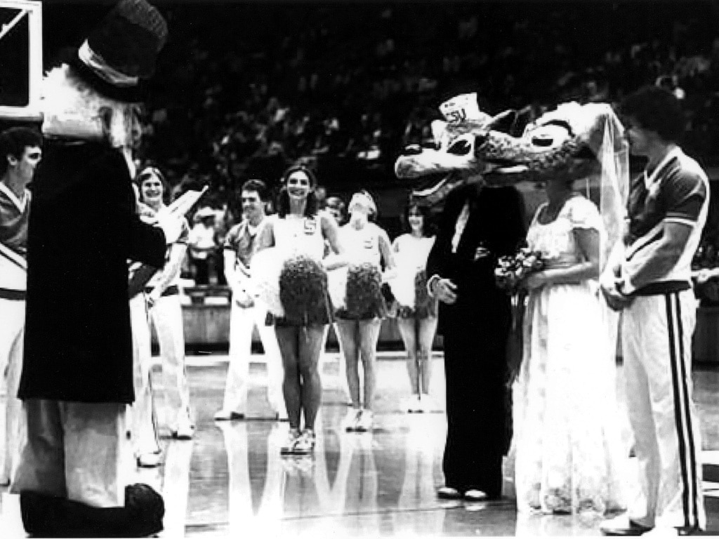The two wolves worked in harmony through the rest of the 1970s, and Weedon wanted to make that union permanent. On Feb. 28, 1981, the mascots exchanged wedding vows during halftime of a men’s basketball game against Wake Forest. Chancellor John Caldwell gave the bride away and Wake’s Demon Deacon mascot performed the ceremony at midcourt.