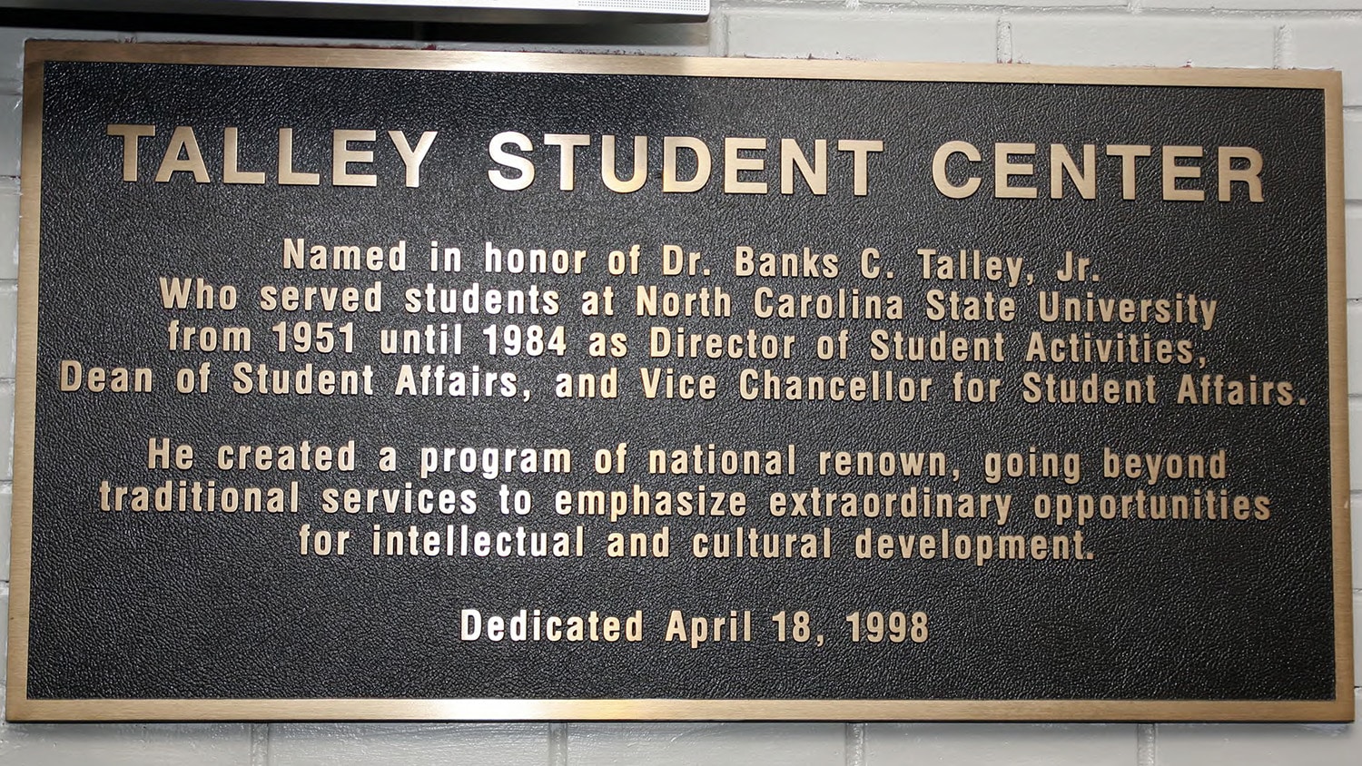 1998年,在学生事务处主任托马斯·斯塔福德的推动下,大学学生中心更名为塔利学生中心,以纪念小班克斯·塔利,他自1951年以来在北卡罗来纳州立大学担任各种以学生为中心的职位,是该校第一任学生活动主任(最终成为学生事务副校长),任职时间长达32年。