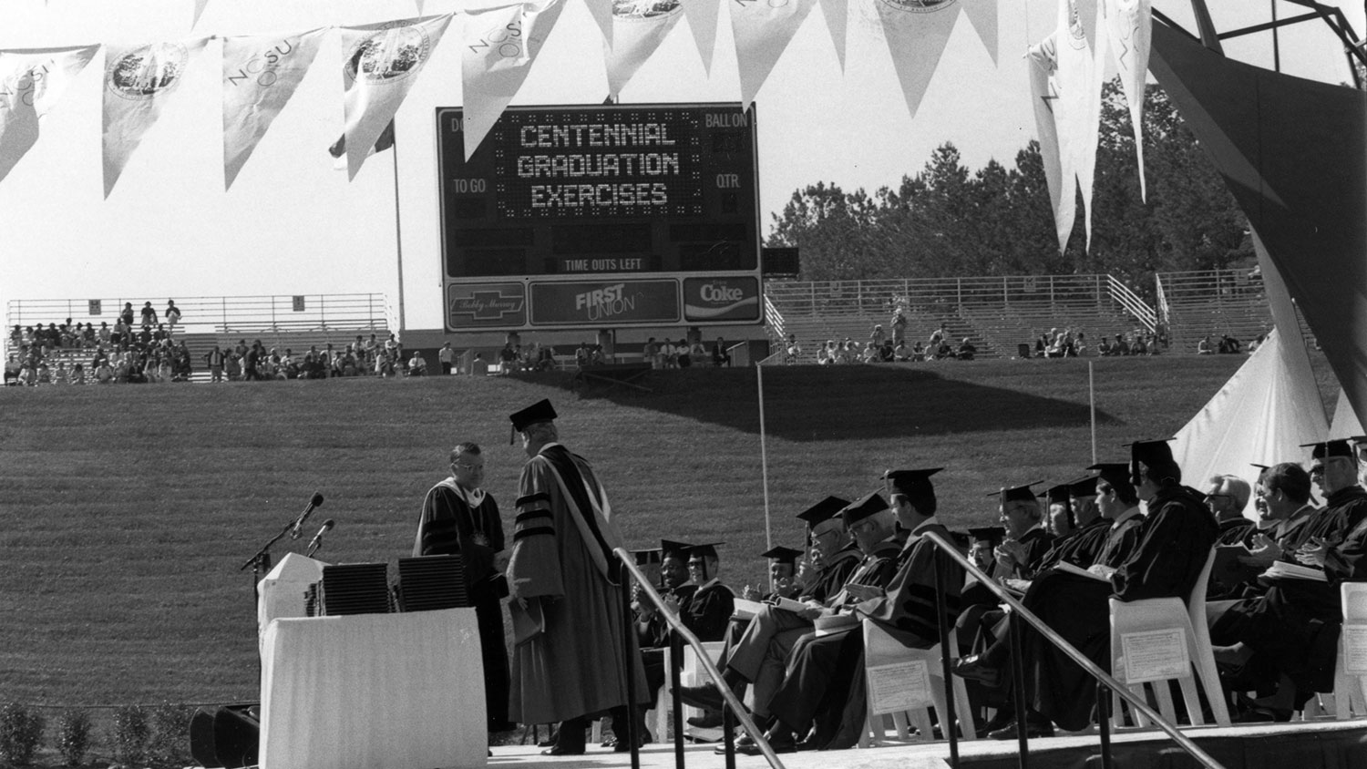 1987年5月7日:哈佛大学结束了为期一年的百年校庆,将传统的春季毕业典礼从雷诺兹体育馆搬到了卡特-芬利体育场,以容纳学校历史上最大的毕业班。校长布鲁斯·波尔顿在毕业典礼上致辞。随后几年的户外活动演讲嘉宾包括诗人兼作家玛雅·安杰洛(Maya Angelou, 1990年),她是学校历史上第一位女毕业典礼演讲嘉宾;参议员伊丽莎白·多尔(1994),北卡罗莱纳州人;儿童电视节目主持人弗雷德·罗杰斯(1996);美国陆军上将休·谢尔顿,参谋长联席会议主席,北卡州立大学校友。1999年冬天,随着PNC体育馆的开放,毕业典礼又搬回了室内。