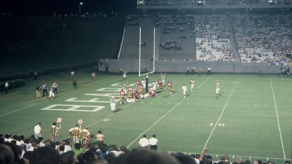 1967年8月19日:在当时被称为卡特体育场的第一个夜间活动是华盛顿红皮队和纽约巨人队之间的NFL表演赛,当时学校尝试了一个照明系统,该系统安装在体育场1966年首次亮相和狼队难忘的1967赛季开始之间。由于体育场周围的交通问题,比赛推迟了10分钟。这是连续四场季前慈善比赛中的第一场,由罗利Jaycees举办,以筹集资金,委托进行可行性研究,以确定北卡罗来纳动物园的位置。(他们希望是罗利。)这场比赛对威尔明顿出生的桑尼·尤根森(Sonny Jurgensen)来说是某种意义上的回归,他曾在杜克大学(Duke)效力,是红皮队(Redskins)的首发四分卫;来自华盛顿的前北卡罗来纳后卫克里斯·汉伯格;以及北卡州立大学的进攻线锋,巨人队的达雷尔·戴斯。这场比赛有三个NFL最有价值球员四分卫Jurgensen, Earl Morrall和Fran Tarkenton。华盛顿队在33,525名观众的见证下以31比13赢得了季前赛表演赛,这是在东南部观看NFL季前赛的人数最多的一次。门票只能邮寄,每张6美元,外加50美分的手续费。