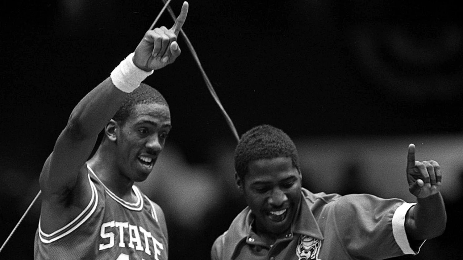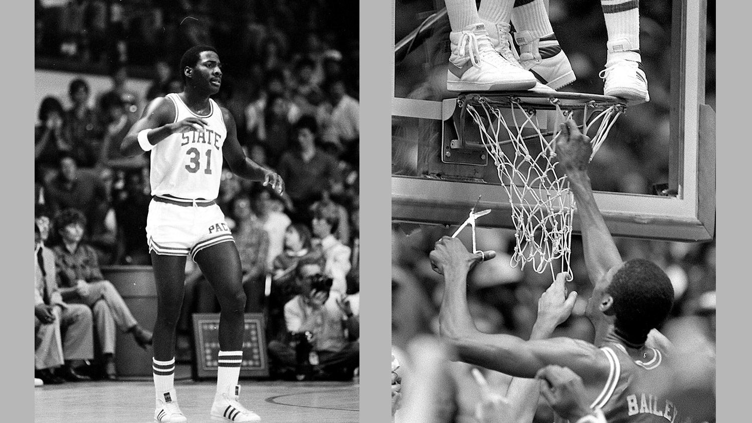 最著名的是,迈尔斯爬到篮板的顶部,坐在上边缘,而队友科泽尔·麦昆站在篮筐上,而球队的其他成员轮流砍下篮网。