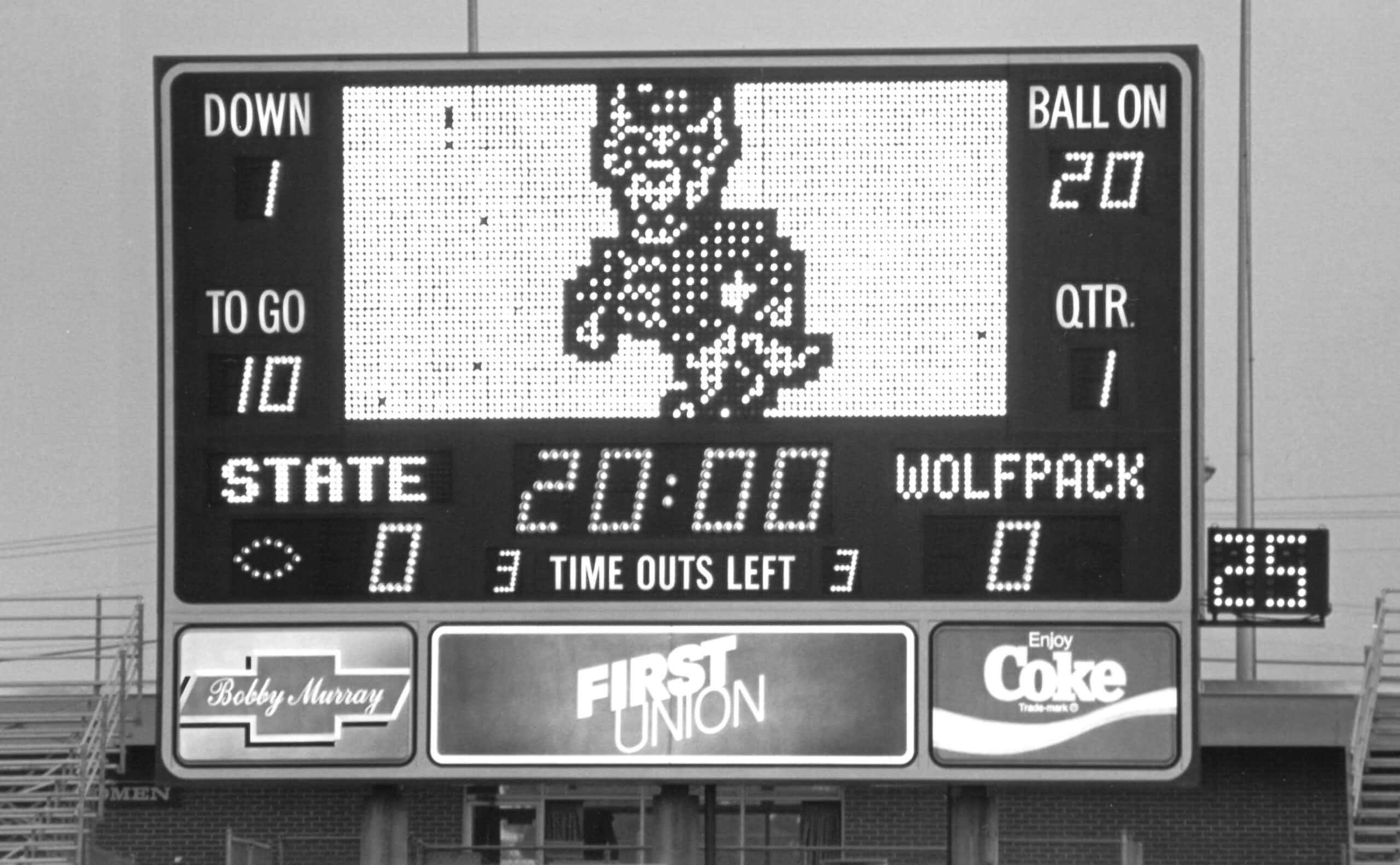 In 1985, NC State gained some notoriety when it installed one of college football’s first animated videoboards at a cost of $500,000, paid for by three title sponsors: First Union Bank, Bobby Murray Chevrolet and Coca-Cola.