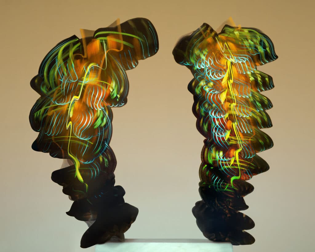 布:过程和我对鸟使用的方法相似:通过合并Adrian视频序列框架和算法,我们停止在飞行中看到昆虫显示有机形状 表示雕塑或花