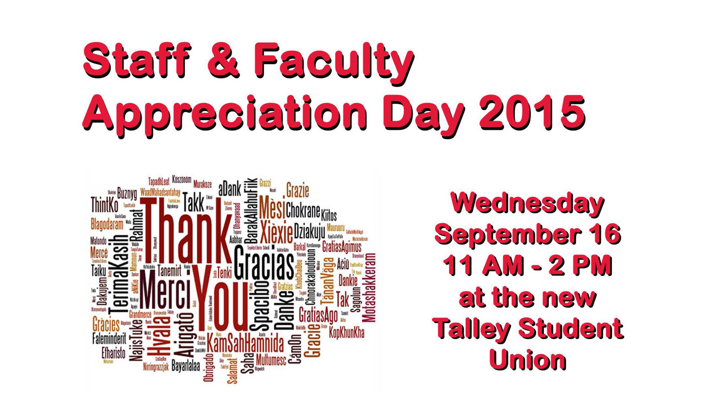 所有北卡罗来纳州的员工都被邀请参加在塔利学生会举办的2015教职工感恩日活动。学校将提供免费食物和其他奖品,以表彰每天的贡献使。