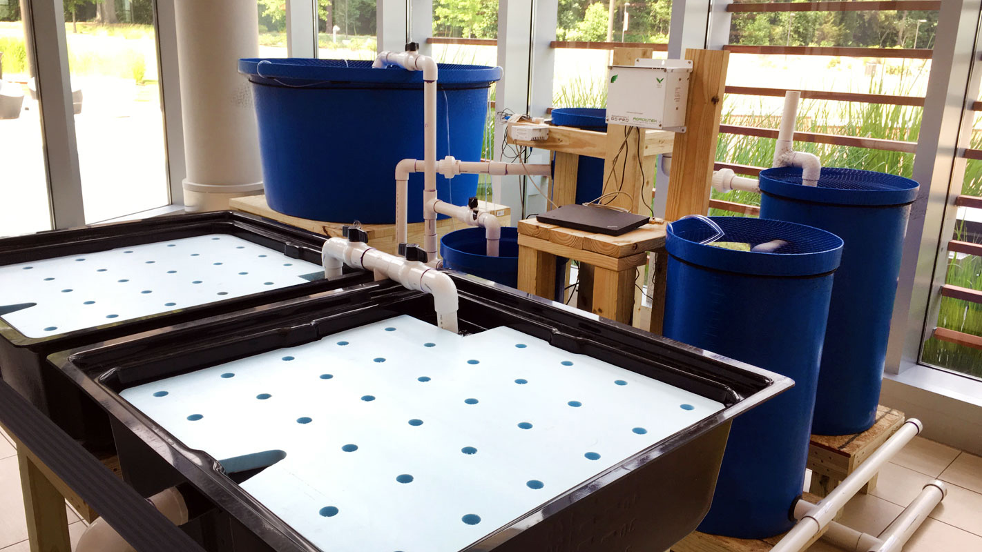 今年夏天,你可以到塔利学生会(Talley Student Union)逛逛,看看由学生设计的垃圾箱、管道、鱼和莴苣组成的系统,它展示了该州发展最快的农业之一实践。