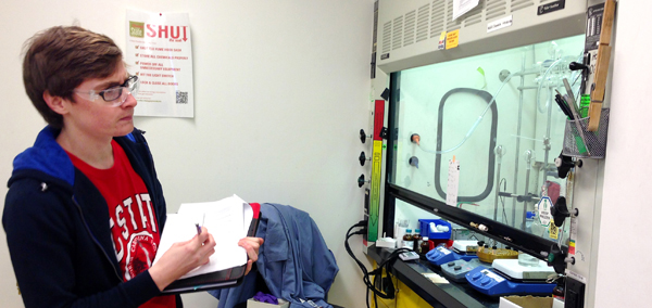 一名学生在校园里漫游实验室,以确保通风柜被正确使用。每周步行的结果是节能和改善安全。
