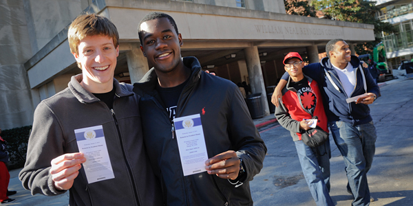 迎接一些担保门票的幸运学生,以便在校园上看到奥巴马总统周三。