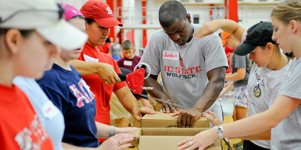 当北卡州立大学的学生们在秋季学期返回校园时,他们要做的第一件事,就是在打开他们的飞盘并启动他们的游戏站之前,帮助为“现在停止饥饿”组织打包100万份餐食。“现在停止饥饿”是一个国际救援组织,在整个发展中国家提供营养的预包装餐食世界。