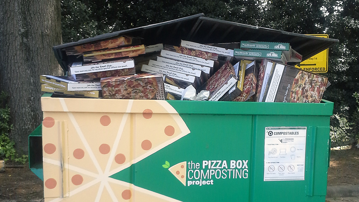 在NC州的废物减少和回收办公室和大学提供的一个试点项目的就职年,学生、工作人员和教师们在校园周围堆放了8700多个比萨饼盒。住房。